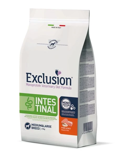 Exclusion Diet Intestinal All Breeds ist ein diätetisches Alleinfuttermittel für ausgewachsene Hunde zur Reduzierung akuter Resorptionsstörungen des Darms und zum Ausgleich von Verdauungsbeschwerden. Dieses Alleinfuttermittel hat einen erhöhten Elektrolytgehalt, hochverdauliche Inhaltsstoffe und einen niedrigen Fettgehalt.
